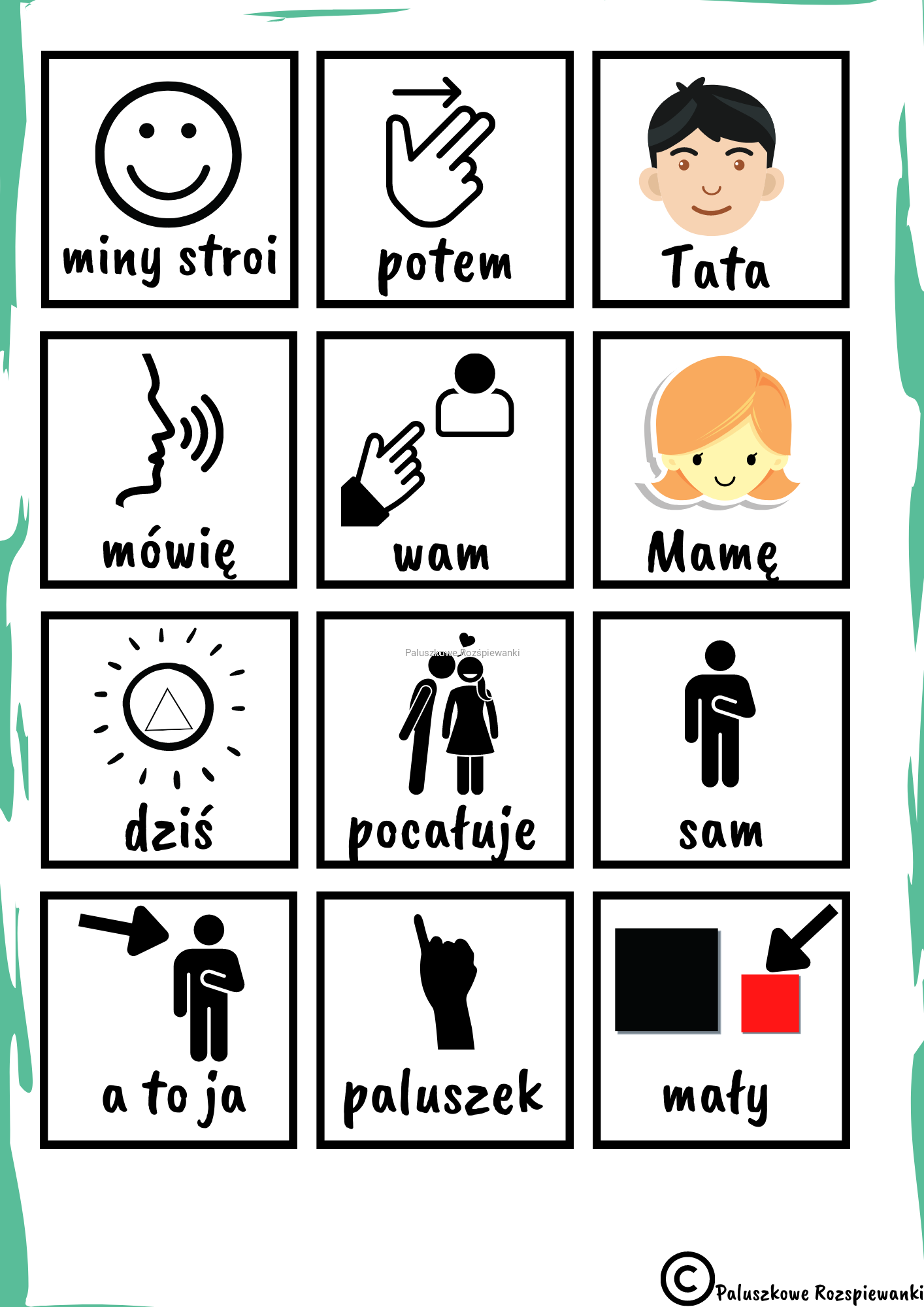Autorska rymowanka do zabawy paluszkowej z kartami do komunikacji wspomagającej i alternatywnej.