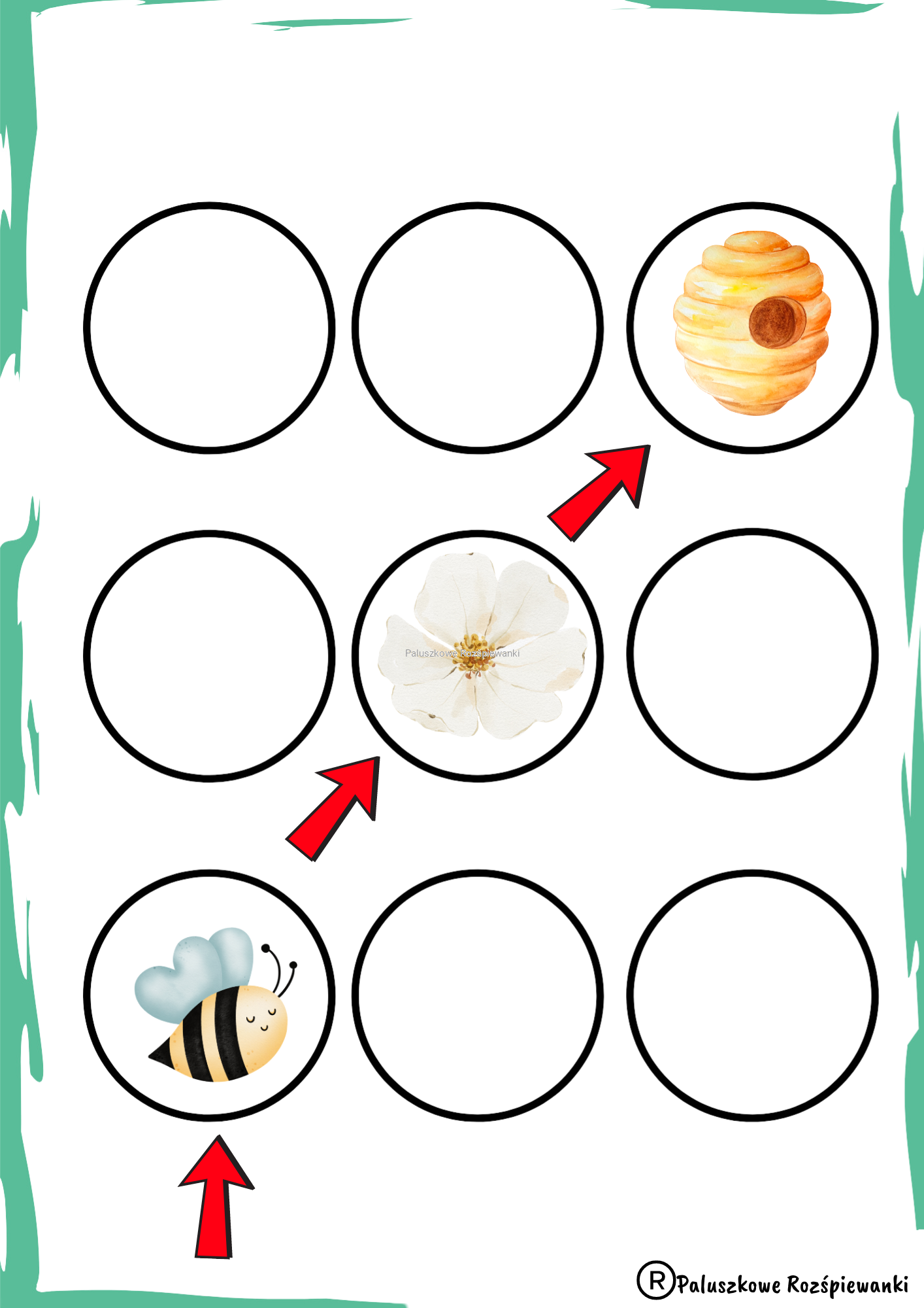 Zamiast rysować na szablonie drogę, którą dziecko ma przebyć, można tę drogę ułożyć z pszczółkowych elementów.